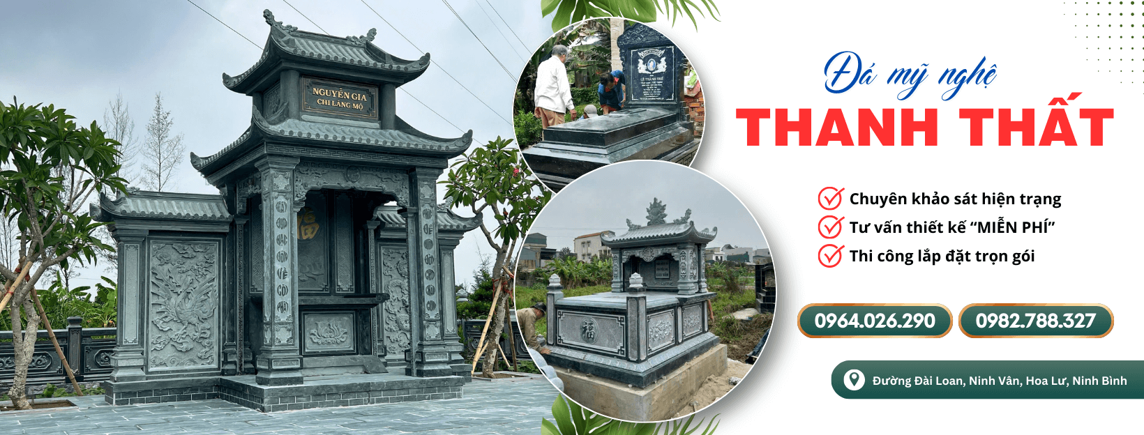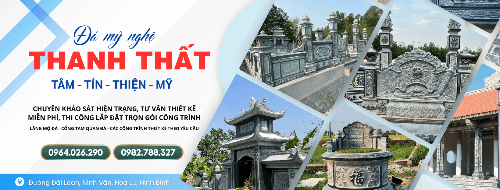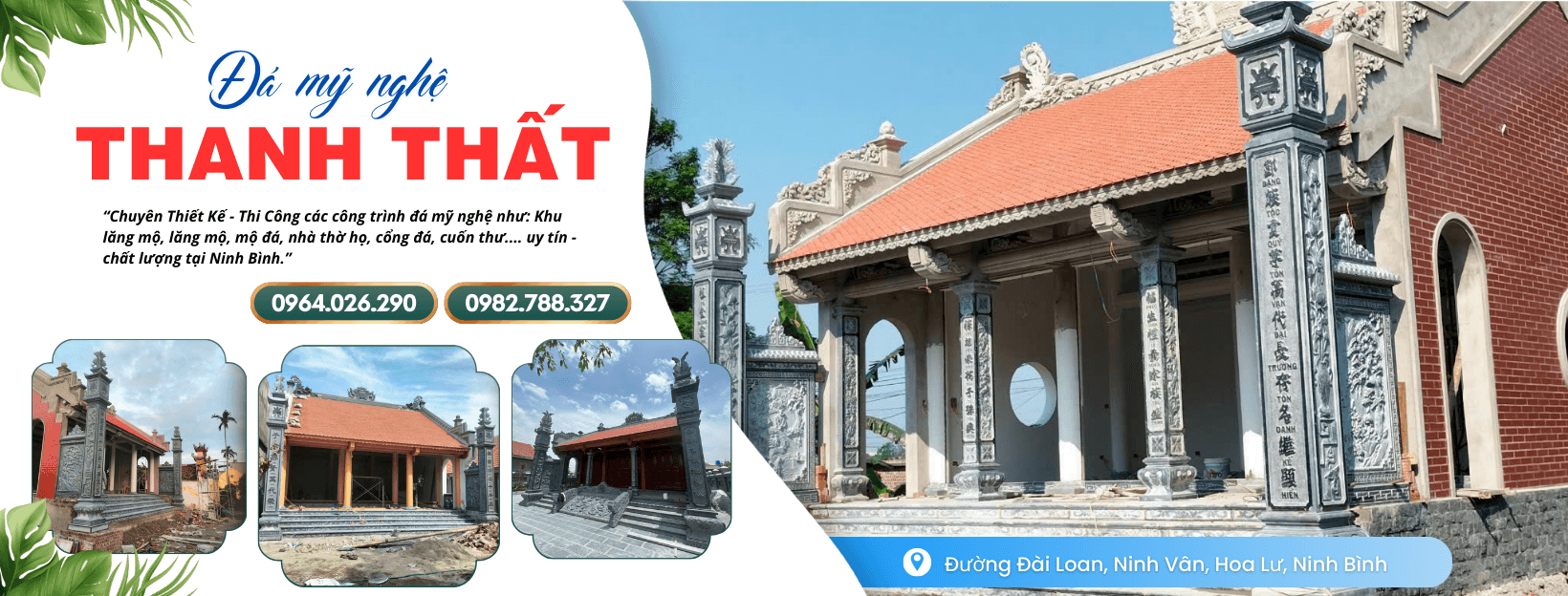 ĐÁ MỸ NGHỆ THANH THẤT là cơ sở đá mỹ nghệ tại Ninh Vân – Hoa Lư – Ninh Bình với nhiều năm trong lĩnh vực thiết kế thi công, trùng tu, làm mới các công trình đá mỹ nghệ cho khu lăng mộ, đền, đình, chùa, biệt thự, nhà thờ …, cung cấp: tượng đá, con giống đá….và các công trình đá mỹ nghệ trang trí theo yêu cầu.